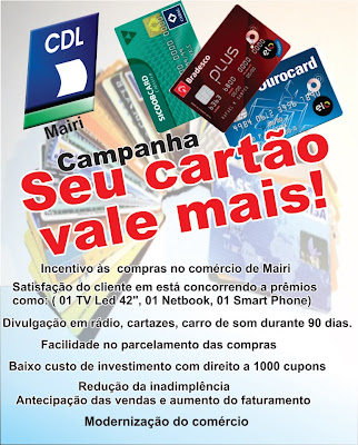 Página inicial CDL de Mairi lança campanha "Seu cartão vale mais" PorAgmar Rios -24/01/2013 0 Comentários