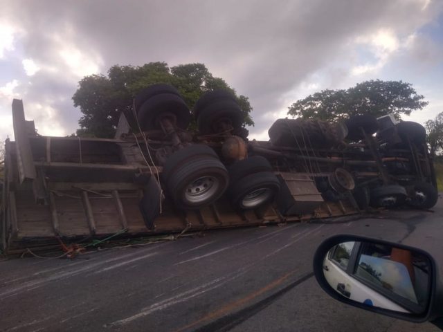 De acordo com as informações um caminhão carregado de manga tombou em uma curva próximo a entrada no povoado do Barro Duro.