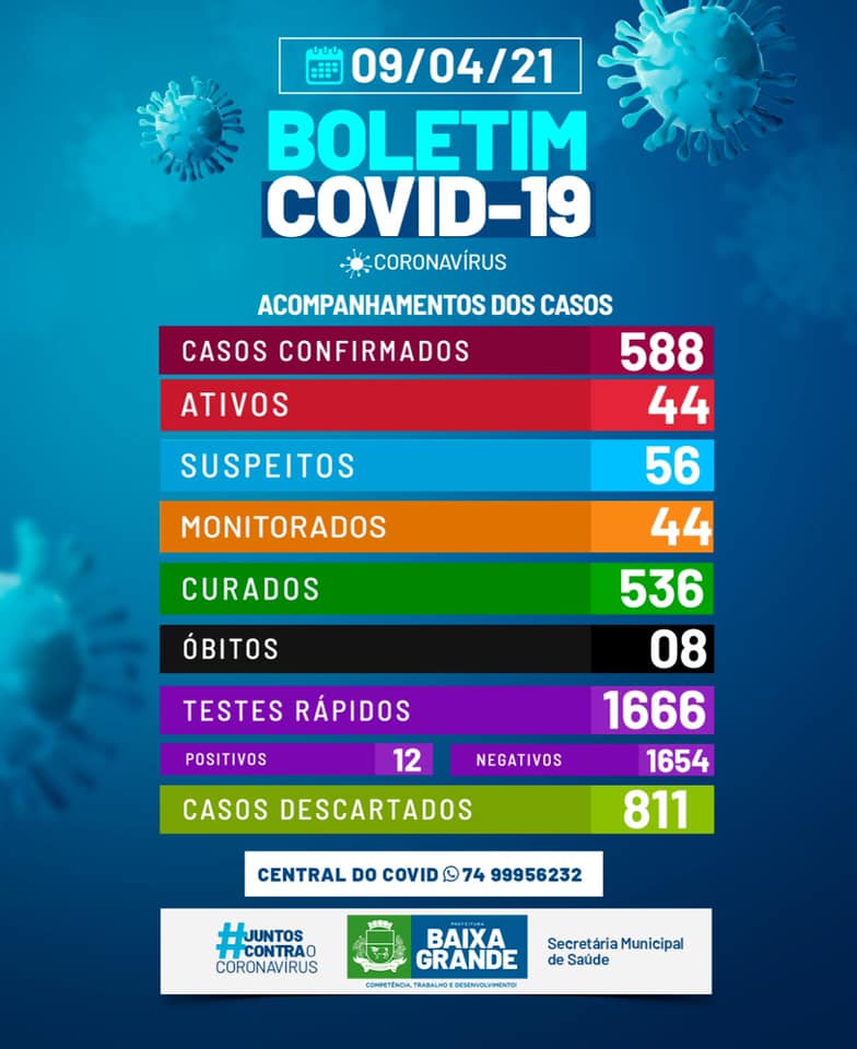 Página inicialCovid-19 Boletim Epidemiológico de Baixa Grande-BA - 09/04/2021 PorAgmar Rios -10/04/2021 0 Comentários A Secretaria Municipal de Saúde de Baixa Grande divulgou nesta sexta-feira (09), os dados do Covid-19 no nosso município.Vamos juntos, na luta contra a Covid-19.